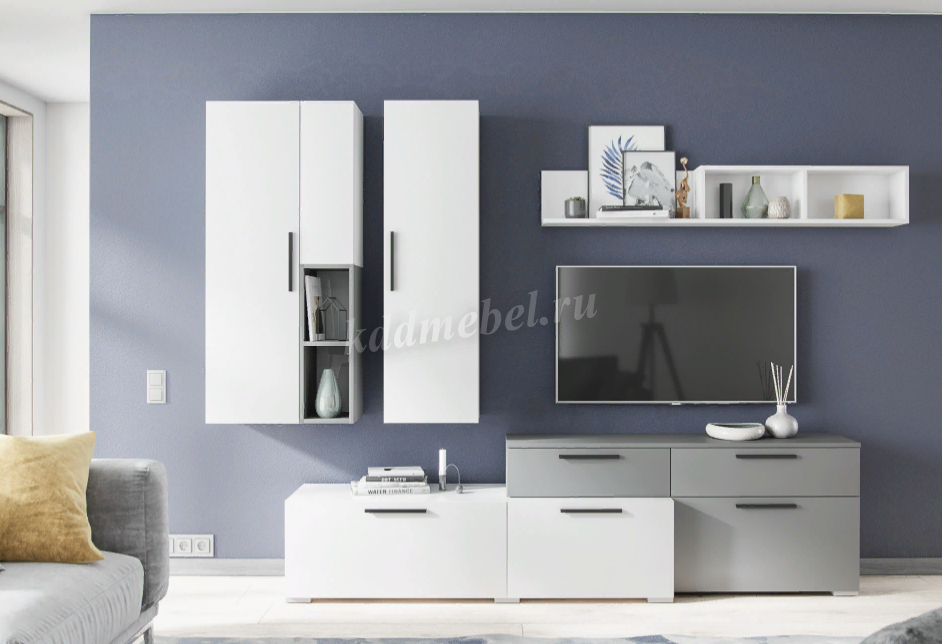 Ультрамодная и компактная гостиная Альберо станет украшением Вашего дома. Коллекция представлена навесными шкафами-пеналами, тумбами под ТВ-аппаратуру, открытыми стеллажами и навесной полкой. Благодаря разнообразию модулей Вы сможете расположить все Ваши вещи: бытовые мелочи, предметы декора, книги, технику и многое другое. Основным цветом мебели выступает белый: освежает интерьер помещения и визуально расширяет пространство. В сочетании с благородным дубом вотаном или стильным серым графитом белый цвет раскрывается по-новому.