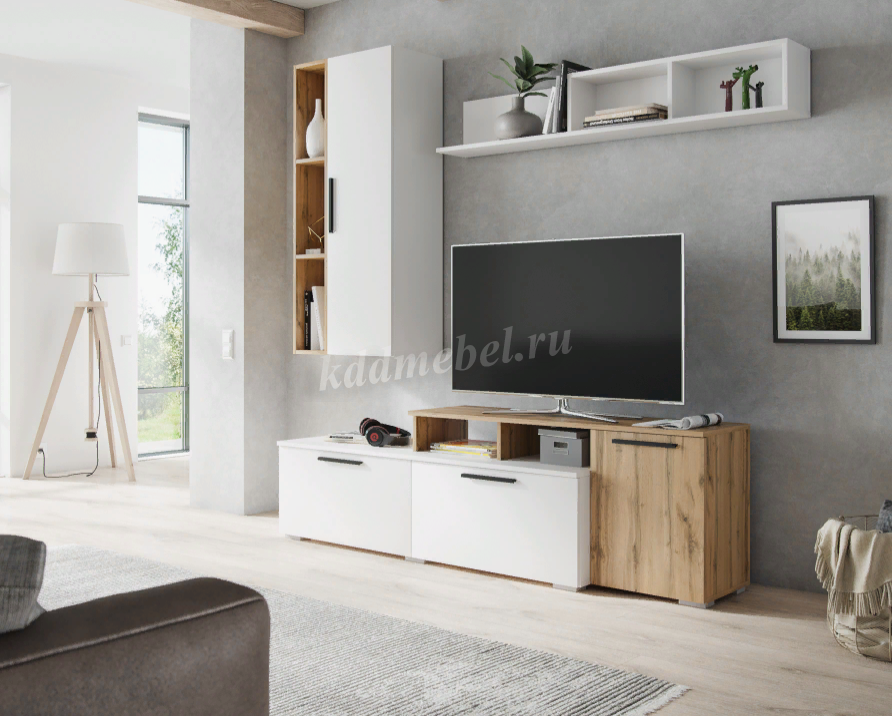 Ультрамодная и компактная гостиная Альберо станет украшением Вашего дома. Коллекция представлена навесными шкафами-пеналами, тумбами под ТВ-аппаратуру, открытыми стеллажами и навесной полкой. Благодаря разнообразию модулей Вы сможете расположить все Ваши вещи: бытовые мелочи, предметы декора, книги, технику и многое другое. Основным цветом мебели выступает белый: освежает интерьер помещения и визуально расширяет пространство. В сочетании с благородным дубом вотаном или стильным серым графитом белый цвет раскрывается по-новому.