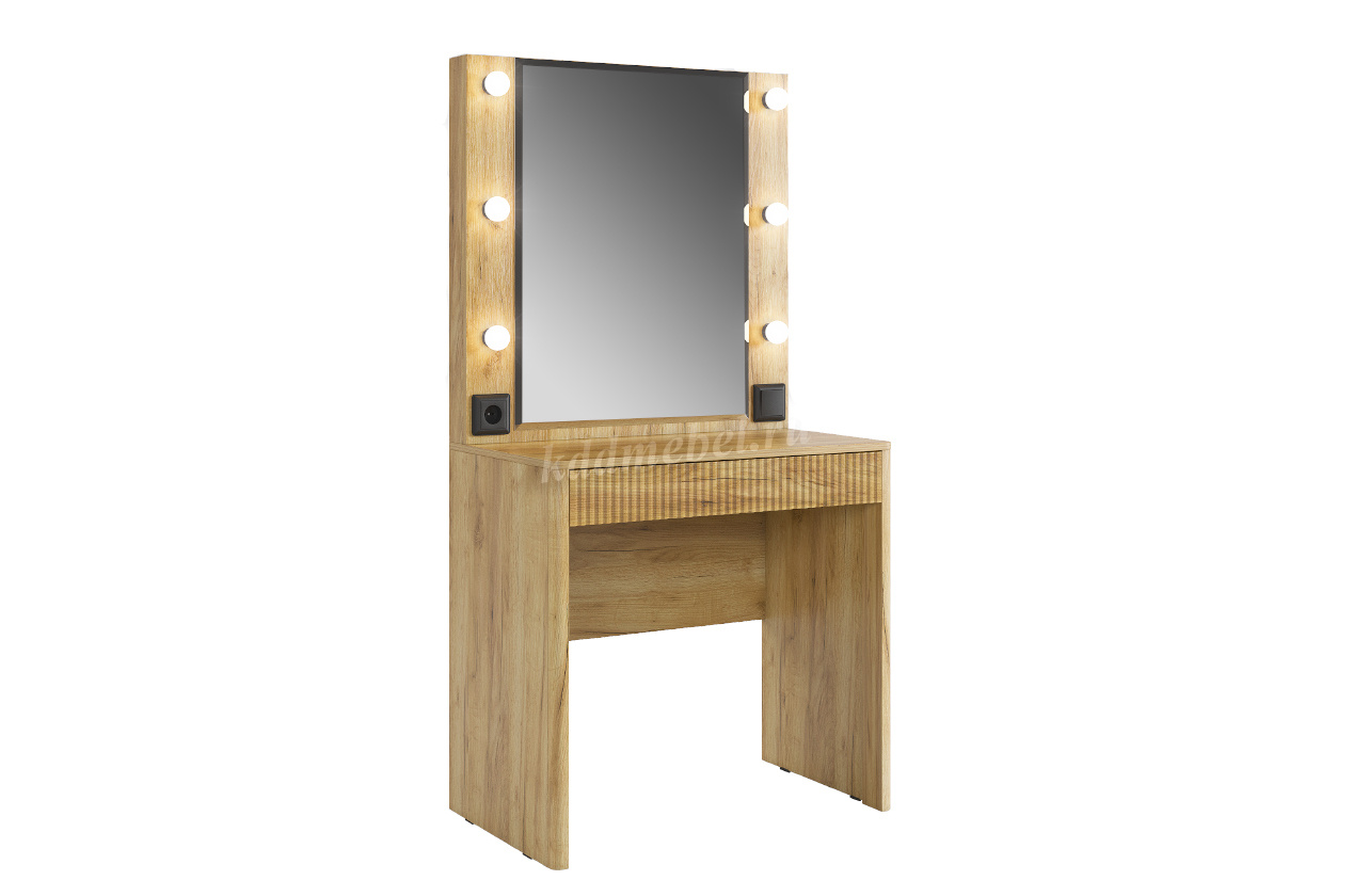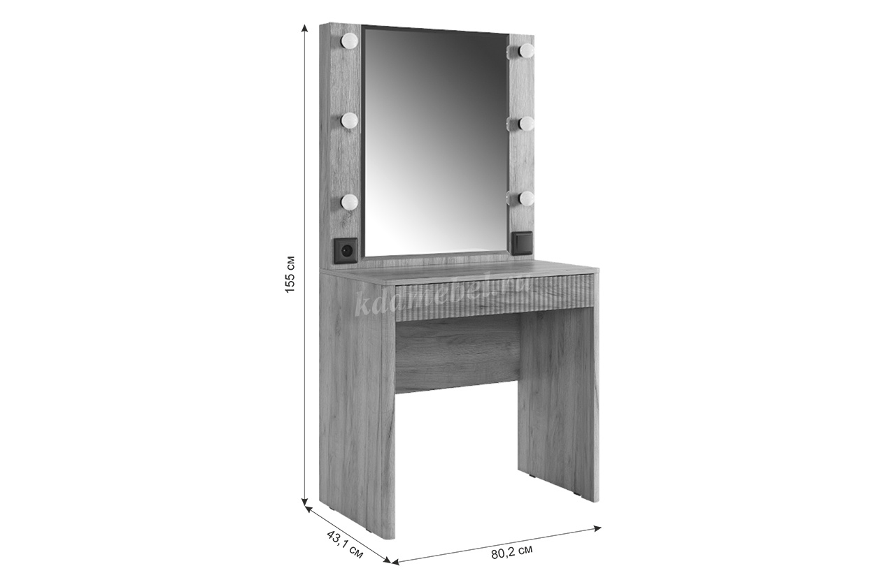Трюмо Адам — это идеальное сочетание стиля и практичности. С широким фацетированным зеркалом, в котором встроена подсветка из 6 лампочек, оно создает атмосферу профессиональных студий визажистов прямо у вас дома. Комфорт и функциональность обеспечиваются дополнительными элементами, такими как выключатель, розетка для фена и выдвижной ящик для хранения украшений и косметики. Элегантные закругленные углы завершают дизайн, делая его идеальным дополнением к вашей спальне.